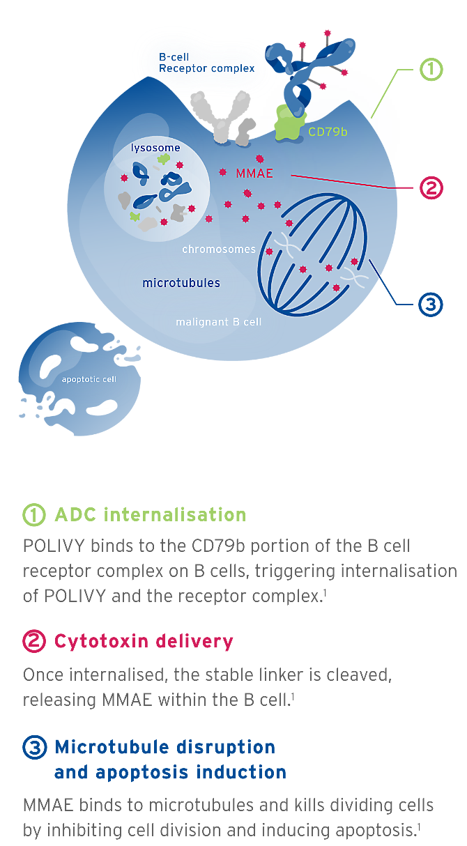 POLIVY is an antibody-drug conjugate (ADC) targeted to CD79b, which is ubiquitously expressed on the surface of B-cell lymphomas1