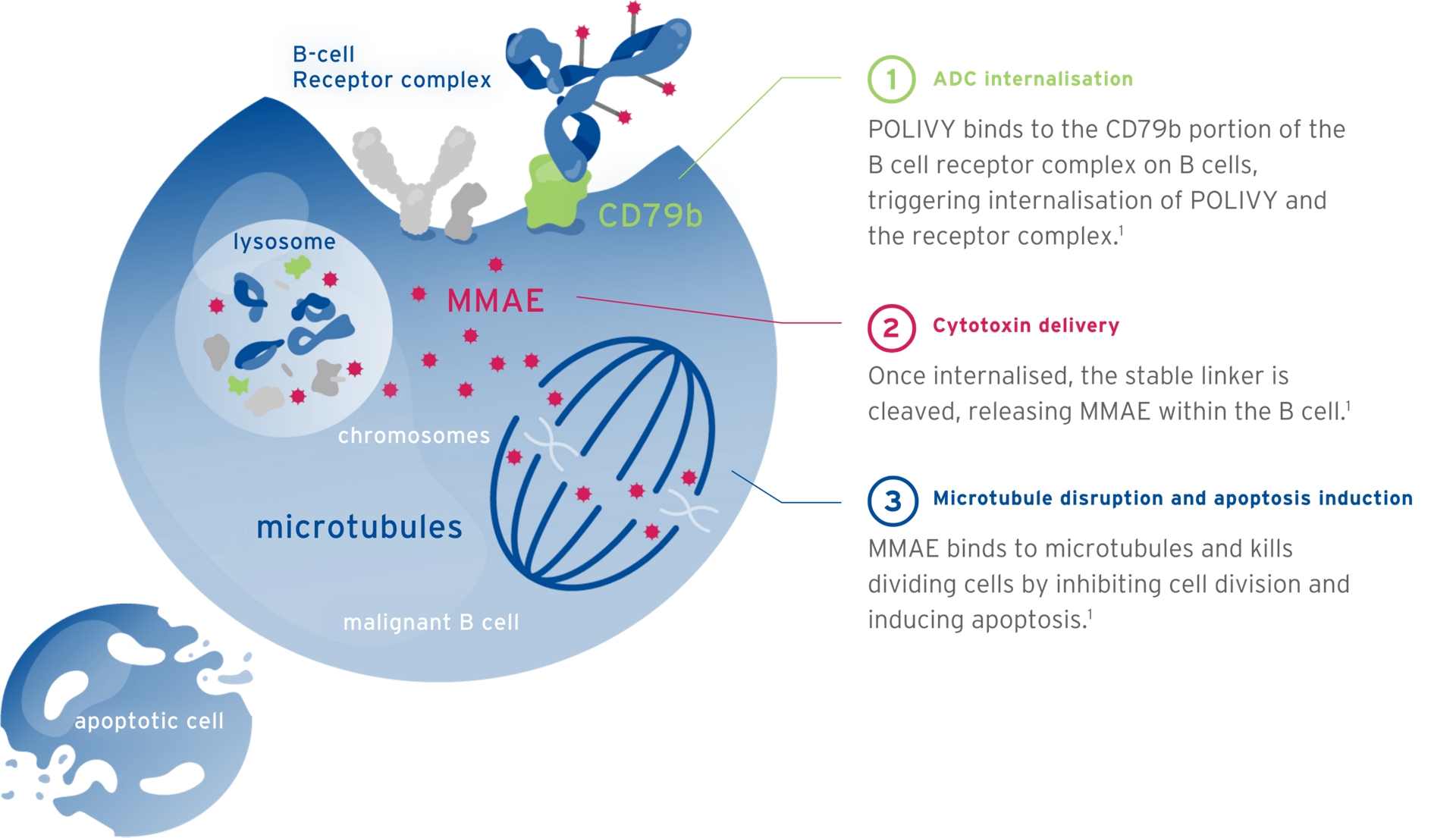 Polatuzumab vedotin is a CD79b-targeted antibody-drug conjugate that preferentially delivers a potent anti-mitotic agent (monomethyl auristatin E, or MMAE) to B-cells, which results in the killing of dividing B-cells.1